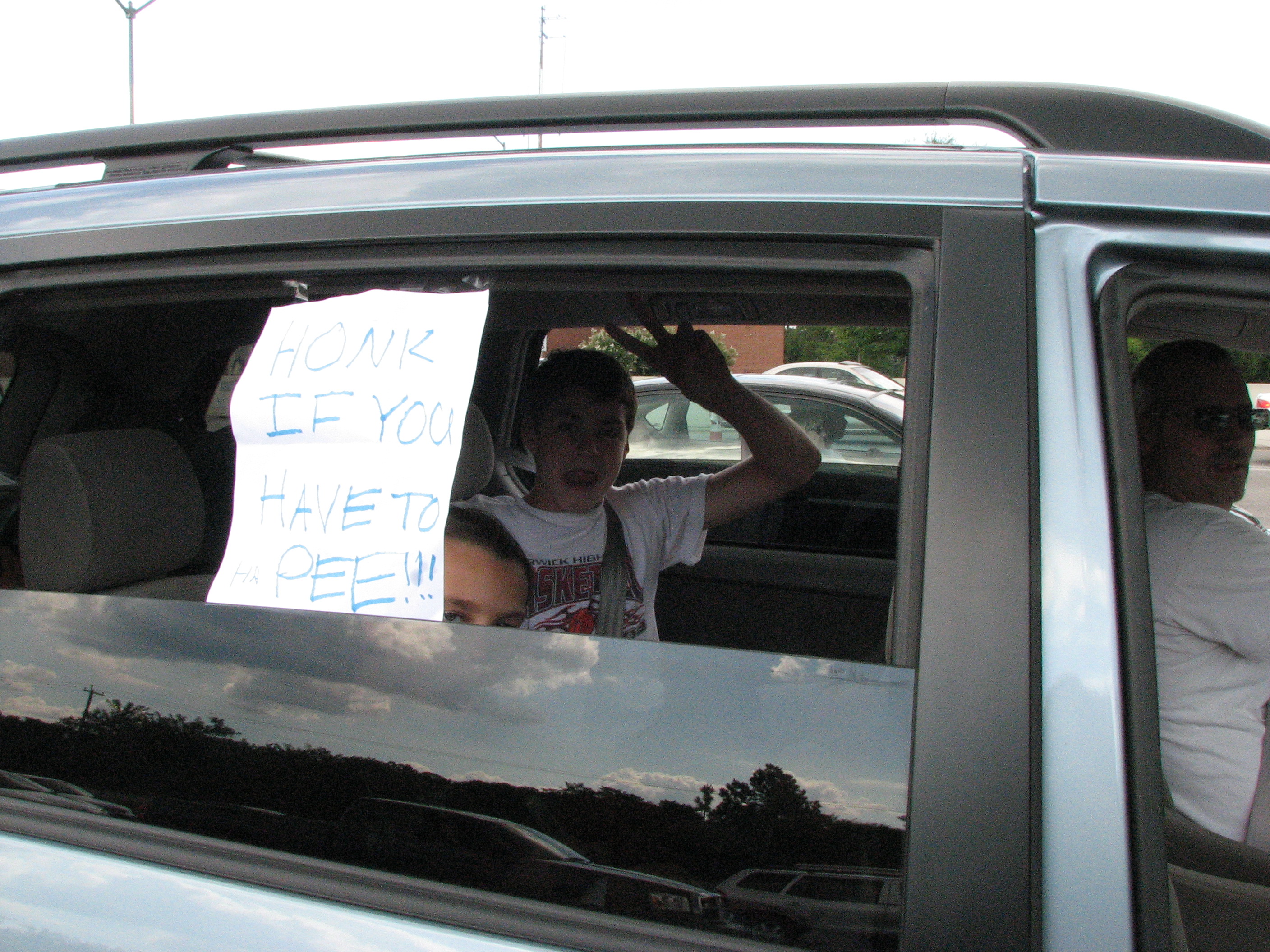 #4- Write a sign that says, “Honk if you have to pee!!” This provides endless hours of fun! BTW, LOTS of people honked their horns! π Sorry you can’t read the sign that well, I had to take a quick picture! I don’t have much experience taking pictures while stuck in traffic on a major highway! π