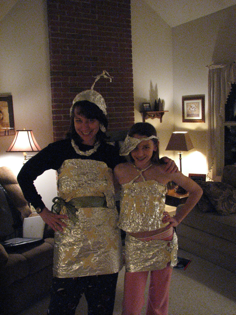 • I had fun camping out in the basement with The Inventor, we were so silly and made clothes out of foil.  I quickly realized that choosing a career as a teacher was the right thing for me, and fashion design is something I could never do.  While The Inventor has a such a creative, fashion designing brain that I do not!  And here is………oh I can’t believe I am going to post this…..uh…..here is a picture of our stylin foil outfits!