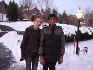 Here are he and SportTman enjoying spaghetti in our basement! And The Inventor with Sir Isaac ( that will be his blog name) out in the snow, after a fun snow ball battle!