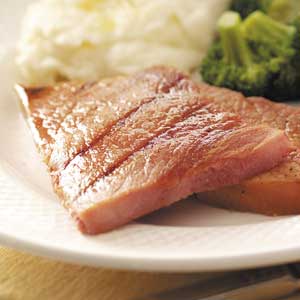 • Coat grill rack with cooking spray before starting the grill. Drain and discard marinade. Grill ham steaks, covered, over medium heat for 10-15 minutes or until heated through, basting frequently with reserved marinade. Yield: 12 servings.