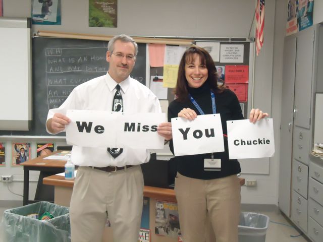 I had tons of staff and students take a picture holding a “we miss you” sign and sent it into the hospital for him.  Here is one of my favs of hubs and I at school. 🙂