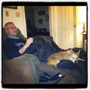 Our new TV ( and thanks to our friend who helped to mount it for us!!!).  It gives Curt something to do during those down times. He still enjoys watching Sports Center and anything sports related.  He loves reclining in this cozy chair with the dog and watching TV.