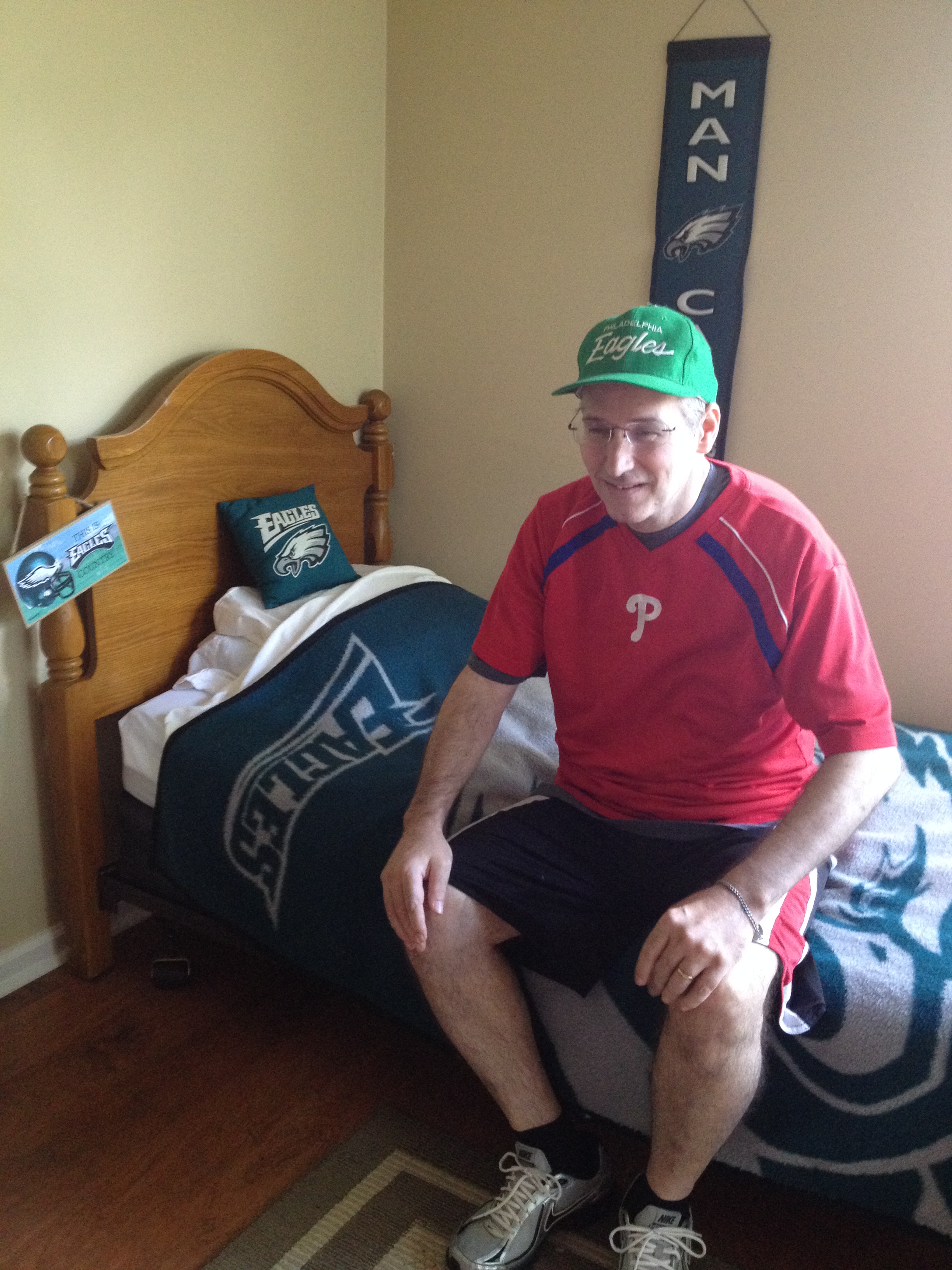 We moved him to a Memory Care facility on July 2 it was a rough first week or so.  But I am so thankful he seems to be adjusting.  He enjoys the staff at the facility and feels comfortable and cared for there.  I start school on Tues. this week and despite thinking the best time for Curt to move to a full time memory care facility would have been mid August…..God knew better and July 2 was the perfect time.  He is now well adjusted and I don’t have to carry that worry into the school year with me!  He is eating a little better  and I bring him plenty of Burger King, ice cream, Oreos and Snickers Ice Cream bars to keep him happy.  He still knows me as his “honey” and is always asking when I will get there! He continues to struggle with communication, it is get so much harder to understand his expressive language ( what he is saying).  Yet he seems to still have a strong receptive language ( understanding of what he has heard).  I notice him starting to interact with the other residents and that warms my heart to see him care for them.  Here is a pic of him sitting on his bed in his “man cave.”